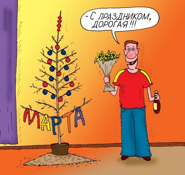 Каждый год я стараюсь делать тематические подборки ко всем основным праздникам, так что и статей с комиксами про 8 марта в этом блоге уже выходило достаточно. А вот материалов не с комиксами, а исключительно с карикатурами еще не было! Так что почему бы не исправить эту ситуацию? На этот раз я отобрал для вас десятку юморных зарисовок про подарки, праздничную еду, цветы и многое другой. Надеюсь, что вам понравится! Художник из Дзержинска Алексей Булатов по профессии занимается бизнесом, связанным со свадьбами, а рисует карикатуры для души. Получается очень жизненно и смешное - взять хотя бы зарисовку, в которой зимние праздники умудрились перемешаться с весенними. Питерский художник-карикатурист Вячеслав Шилов опубликовал свою первую карикатуру еще в 1985 году - в газете «Калининградский комсомолец». С тех пор он успел посотрудничать со многими изданиями, среди которых «Вечерний Петербург» и «Смена». В своей карикатуре про 8 марта это автор решил показать, как некоторые мужчины могут о