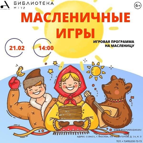 " 21 февраля в 14:00 | ул. Новаторов, д. 14, корп. 2 м. Новаторская В этот день участники познакомятся с традиционными масленичными играми, а также смогут проверить свою ловкость и сообразительность. Гостей ждет увлекательная программа старинных русских игр, а также дополнительные игры на скорость. Требуется регистрация. 🧷 Бесплатная Москва