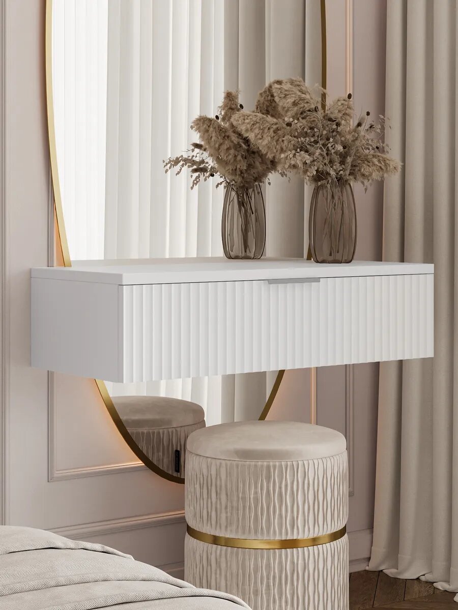 Подвесной туалетный столик из ЛДСП и МДФ в отделке под дуб — компактный, но очень продуманный. Выдвижные ящики, вся необходимая фурнитура в комплекте, крепление к стене — ничего докупать не нужно. Узкий силуэт не «съедает» пространство, а создаёт полноценное рабочее место.