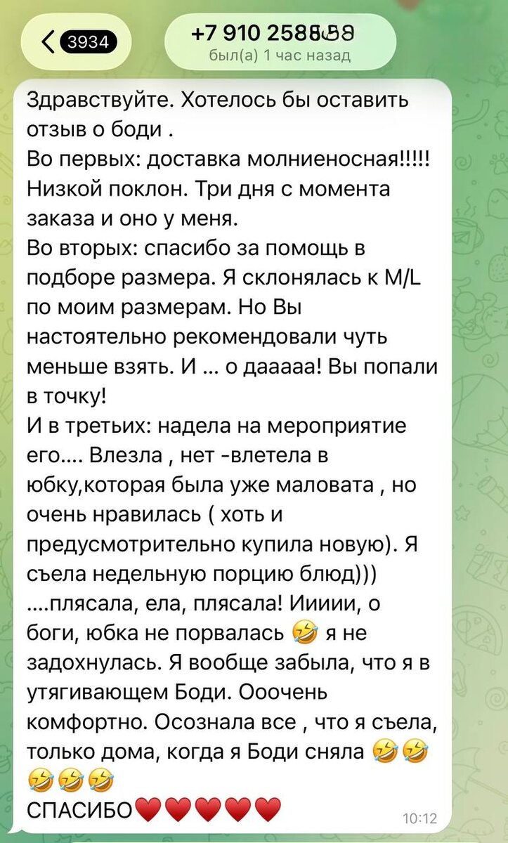 ❤️ Благодарим вас за то, что оставляете свои отзывы, делитесь честными впечатлениями, вашими эмоциями 🥹 …Влезла , нет -влетела в юбку, которая была уже маловата , но очень нравилась ( хоть и предусмотрительно купила новую). Я съела недельную порцию блюд))) ....плясала, ела, плясала! Иииии, о боги, юбка не порвалась ( я не задохнулась. Я вообще забыла, что я в утягивающем Боди… Боди - это то самое изделие, которое сделает ваш образ на 100% идеальным, при этом не испортит настроение чрезмерной утяжкой, ведь такие изделия всегда подбираются точно под ваши параметры ❤️ Еще больше отзывов: #afbshop_обратнаясвязь ✨Задать вопрос и оформить заказ, пишите 👇 https://t.me/all_for_body_shop