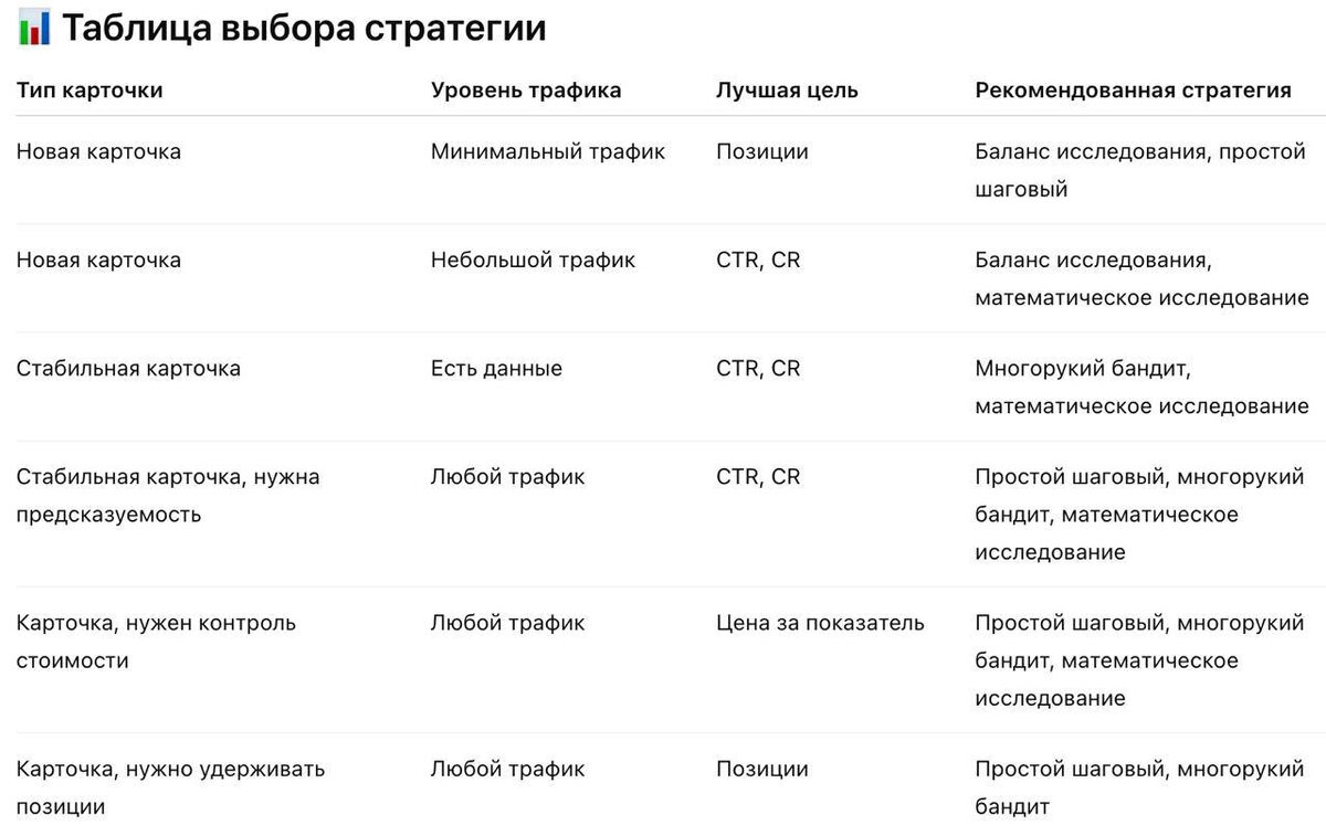 Многие пользователи еще не знают, как работает индивидуальная стратегия. Поэтому дублируем информацию🔥 🚀 Как правильно продвигаться на Wildberries: четыре стратегии, цели и рекомендации по использованию Сейчас у нас есть возможность управлять каждым нормализованным запросом, выставлять индивидуальные цели и выбирать подходящий алгоритм под каждую задачу. Ниже — подробный разбор всех четырёх стратегий, таблица и практические рекомендации, основанные на работе с продвижением. ⸻ Четыре стратегии продвижения 1. Простой шаговый алгоритм Предсказуемый алгоритм, который двигает карточку вверх, если маркетплейс позволяет. Если маркетплейс не даёт подняться выше, алгоритм увеличивает ставку и пробивает выполнение цели. Движение происходит по шагам. Лучше всего работает на новых карточках или товарах с небольшим количеством трафика. 2. Баланс исследования Алгоритм работает сбалансировано. Примерно 30 процентов времени исследует новые позиции. Около 70 процентов времени удерживает карточ