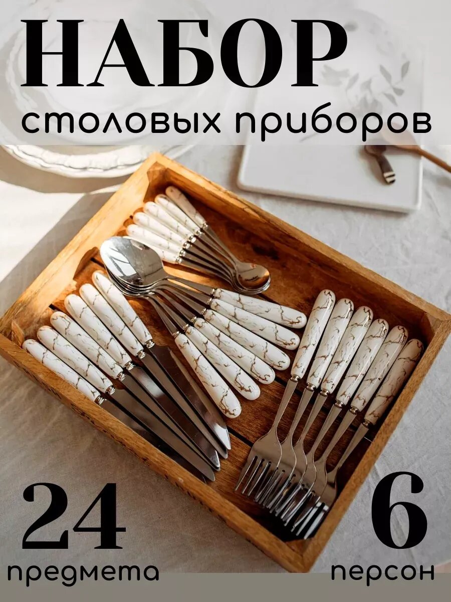Набор из 24 предметов — 6 столовых и чайных ложек, вилок и ножей. Нержавеющая пищевая сталь, ручка из керамики. Гладкая поверхность, приятный вес, удобно лежит в руке. Можно мыть в посудомоечной машине.