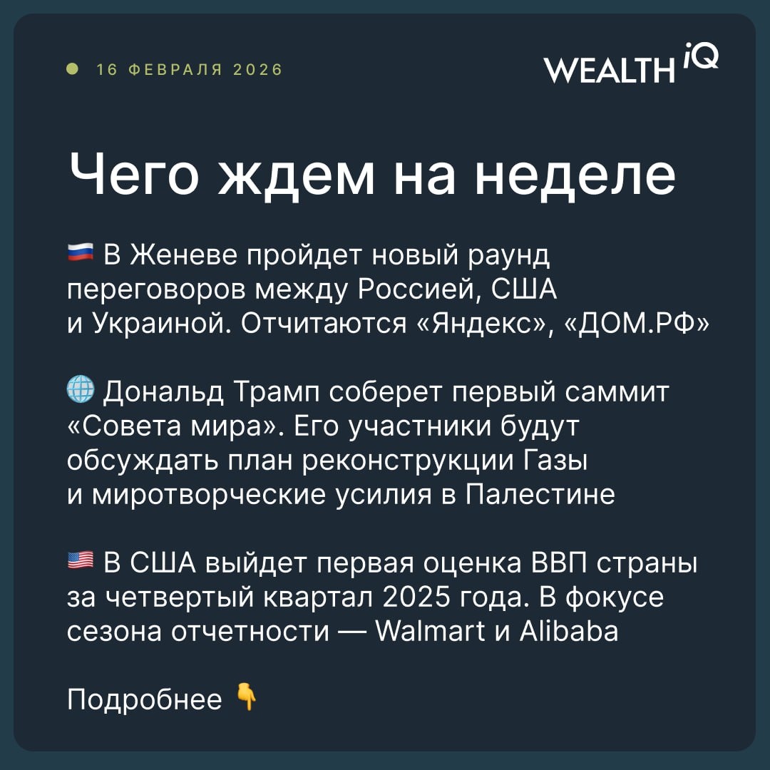 🇷🇺Россия: переговоры, данные по инфляции, корпоративная отчетность На этой неделе (17-18 февраля) в Женеве пройдет новый раунд переговоров между Россией, США и Украиной. В среду Росстат опубликует данные по инфляции за неделю с окончанием 16 февраля, Банк России представит свою оценку инфляции за январь. В четверг регулятор сообщит данные по инфляционным ожиданиям населения в этом месяце. Во вторник свои финансовые результаты за четвертый квартал 2025 года представит «Яндекс», в среду — «ДОМ.РФ». 🌐В четверг Дональд Трамп соберет первый саммит «Совета мира». Его участники будут обсуждать план реконструкции Газы и миротворческие усилия в Палестине. В понедельник многие рынки будут закрыты — из-за Дня президента в США, карнавала в Южной Америке и лунного Нового года в Азии. 🇺🇸В США в пятницу выйдет первая оценка ВВП страны за четвертый квартал 2025 года. В фокусе сезона отчетности — Walmart и Alibaba. #НеделяНачинается 🏦 Wealth IQ