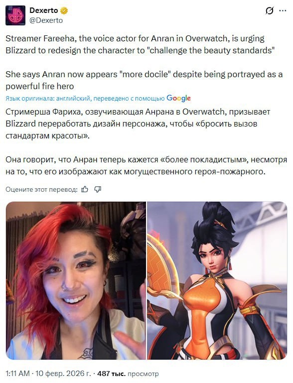 На фоне новых красивых персонажей в Overwatch развернулась драма • Стримерша Fareeha, которая дала голос новой героине Анран, раскритиковала её внешний вид: что у персонажа нереалистичные пропорции, она слишком традиционно привлекательна, и когда актриса записывала реплики, она не представляла её такой. По её мнению, Анран — сильная, смелая девушка с характером, бросающая вызов современным стандартам красоты. • Blizzard прислушались к ней, пообещав изменить облик героини на образ старшей сестры, более грозной, как в одной из короткометражек. • И что ещё важно — персонаж китаянка. Поэтому на тропу войны вышли китайские игроки, которые недовольны и не хотят, чтобы их любимую девочку-сосочку переделывали. Так что теперь Blizzard придётся выбирать, на какой стул сесть. А ещё на хайп неожиданно залетел печально известный борец с повесточкой Grummz и заявил, что женщины не имеют права голоса в игровой индустрии, особенно актрисы озвучки, за что ему накидали с обеих сторон. 🎮 Crunch'N