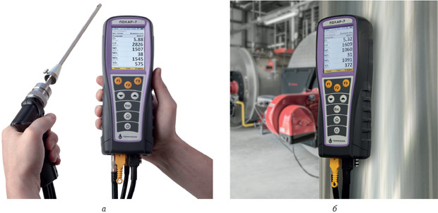 Рис. 1. Переносной многокомпонентный газоанализатор «Полар‑7»: а – с зондом температуры воздуха; б – прикрепленный к металлической поверхности с помощью магнитов