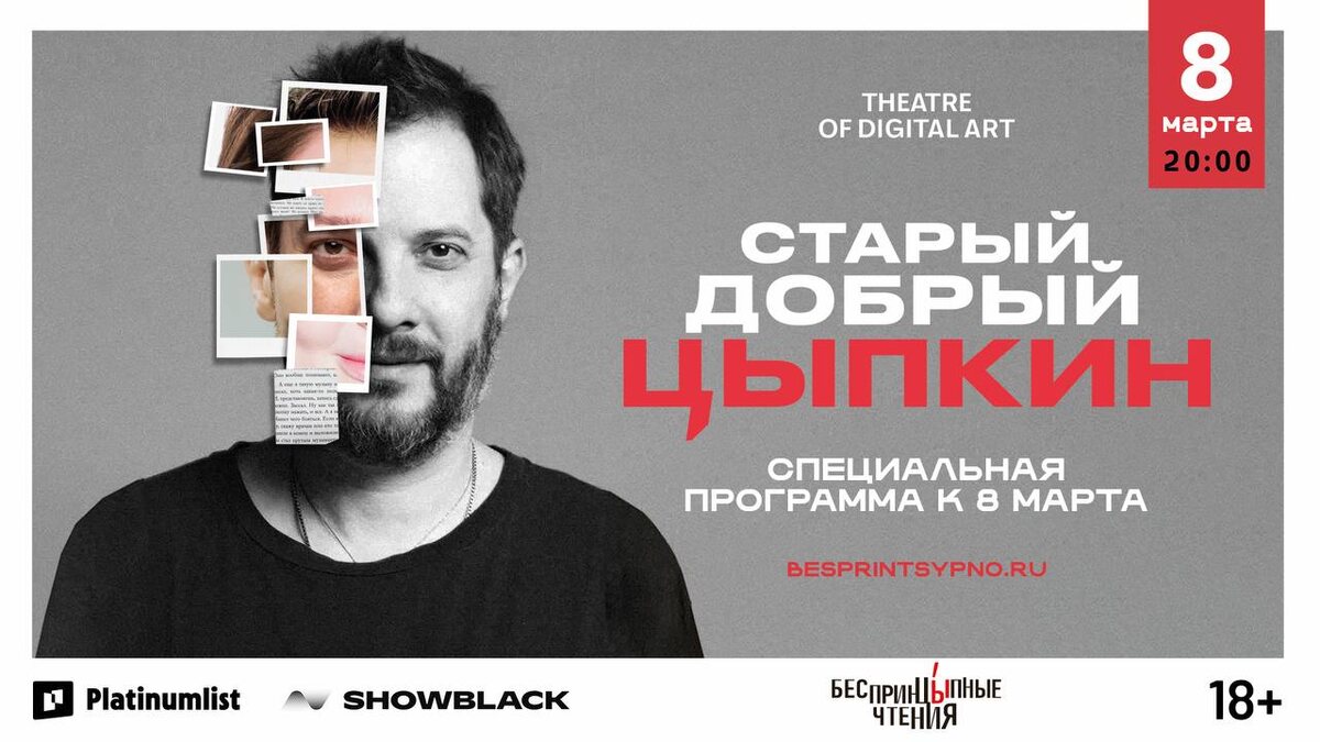 ! «БеспринцЫпные чтения» представляют сольную программу «Старый добрый Цыпкин» — лучшие рассказы и новые истории, которые заставят смеяться и задуматься. Где: TODA - Theatre of Digital Art Когда: 8 марта 2026 Время: Открытие дверей: 19:00 Билеты по ссылке Искромётная проза, живое исполнение и особенная атмосфера праздничного вечера. «За последние несколько лет я написал достаточно неопубликованных материалов, чтобы с чистой совестью приехать в Дубай и представить все это местной взыскательной публике. Так что, дорогие жители и гости Дубая, приходите и делитесь своими мыслями», — Александр Цыпкин. #Реклама #НаПравахРекламы