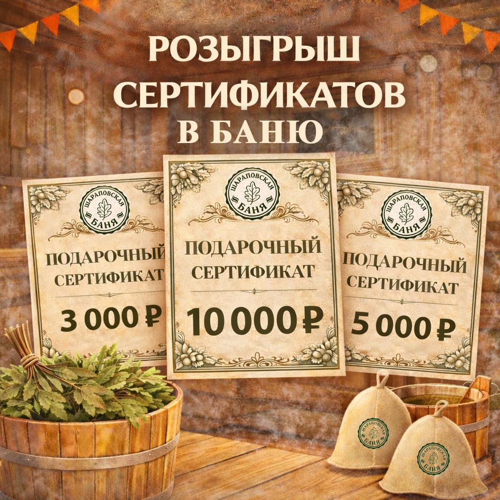 🔥 Премиальная баня в Шарапово проводит розыгрыш подарочных сертификатов: 🥉 3 000 ₽ 🥈 5 000 ₽ 🥇 10 000 ₽ Сертификаты можно использовать на посещение, парения, массаж, кухню, бар, ВИП-комнату или все вместе. Чтобы принять участие, нужно перейти в Telegram-канал бани и выполнить простые условия. 📅 Итоги — 23 февраля 👉 Ссылка на конкурс: https://t.me/+g7qLABe4nJExYzNi Если вы давно собирались сюда — возможно, это ваш знак 😉♨️
