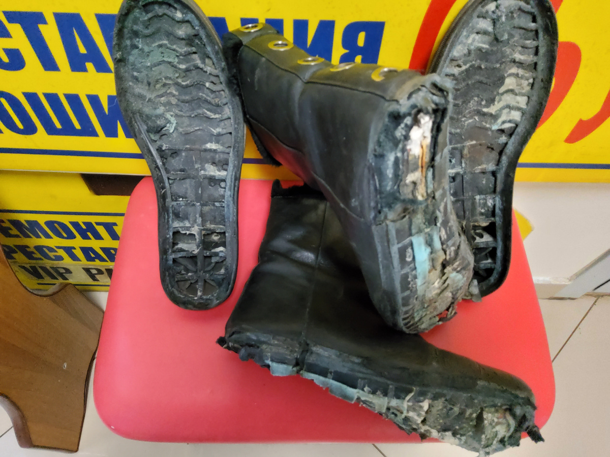 Ботинки побывали в природном потопе.- ну нельзя в них работать на улице в "кашу", но...Принесла в ремонт армянка из соседней бюджетной парикмахерской. Развалилось всё,-отвалились ранты от подошвы, подошвы от верха, сам верх весь потрескался, молнию вырвал, задники сели, набойки поплыли(отклеились), и так по мелочи кой чаго! Взял, как с соседки, пол цены. Они таких цен не понимают. Так же как не понимают, что значит "все клиенты уехали". Я так каждый сезон отмечал для себя как менялась ситуация с правильными клиентами. Очень заметно, как стало уменьшаться количество качественных клиентов. Потом стало уменьшатся количество качественной обуви всех остальных, дальше уменьшилось количество былой качественной обуви "из сервантов", перетаскали всё, ну а сейчас идут последние крохи былой роскоши... И всего то за последние четыре года!