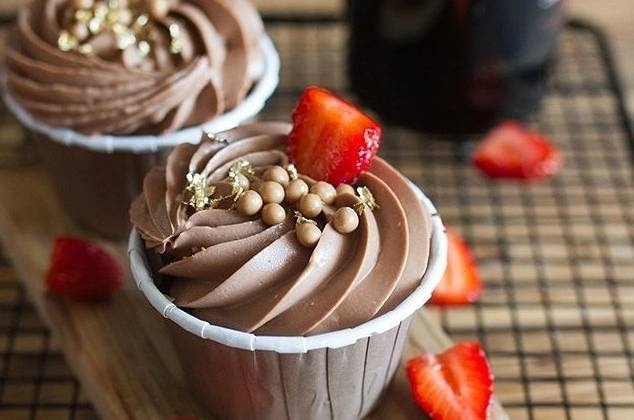 1. Бисквит. Какао-порошок просеять в муку, добавить разрыхлитель и все подвзбить вилкой. Заварить крепкий кофе, если берёте растворимый - то 2 чл на 50-60 г кипятка. Остудить. Растопить масло, остудить. Взбить яйца с сахаром до пышной белой массы. Влить масло, кофе и взбить до пышности. Частями ввести мучную смесь, перемешивать на низк.скорости миксера или вручную, главное, не потерять объём массы. Разлить по капсулам на 1/3 высоты. Печь при 160-170С ок.20-25 мин. Остудить, вынуть серединку.