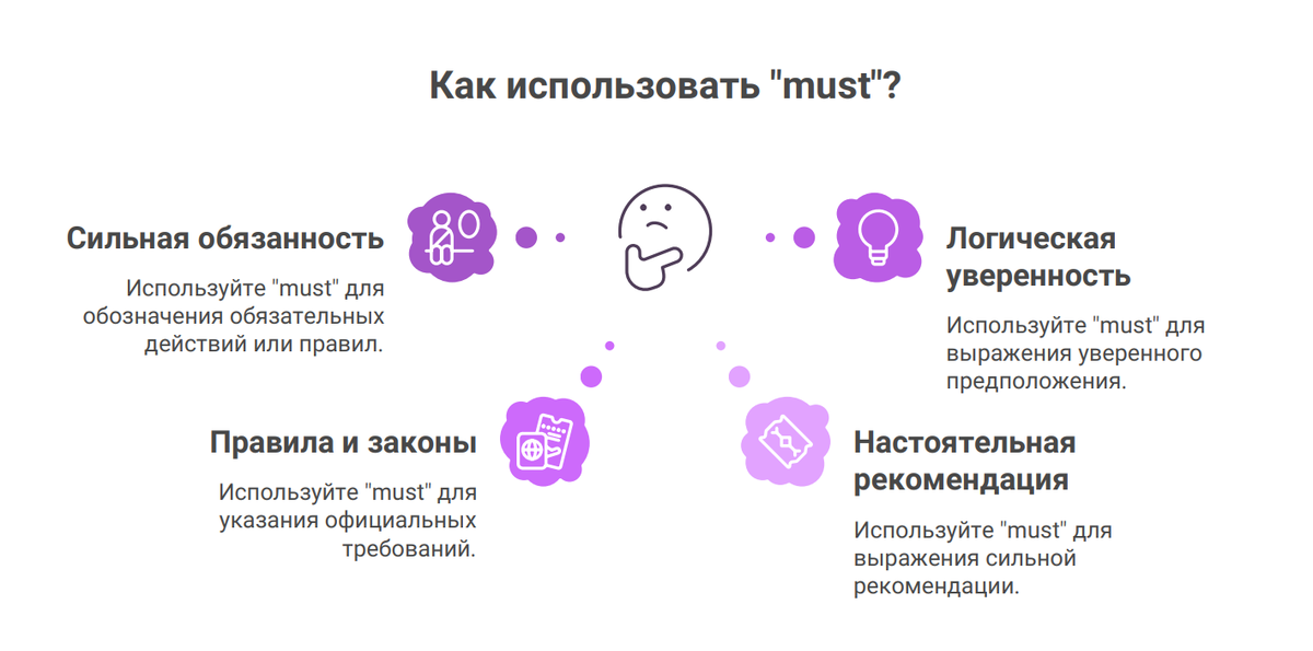Модальный глагол must звучит жёстче, чем can или should. В нём всегда есть оттенок необходимости, обязательности или уверенности. Если коротко — must = «должен», «обязательно», «наверняка». Разберёмся по порядку, когда его используют. Используем must, когда действие обязательно. Это правило, требование или внутренняя необходимость. 🔹 You must wear a seatbelt. - Вы должны пристегнуться. 🔹 Students must do their homework. - Ученики обязаны делать домашнее задание. 🔹 I must finish this today. - Я должен закончить это сегодня. Здесь must звучит серьёзно. Это не совет, а именно обязанность. Очень часто must встречается в официальных объявлениях, инструкциях и правилах. 🔹 Visitors must sign in. - Посетители должны зарегистрироваться. 🔹 You must show your passport. - Вы обязаны предъявить паспорт. 🔹 Employees must wear ID badges. - Сотрудники обязаны носить бейджи. В формальных текстах также может использоваться have to, но must звучит более строго. Иногда must используется не как обяза