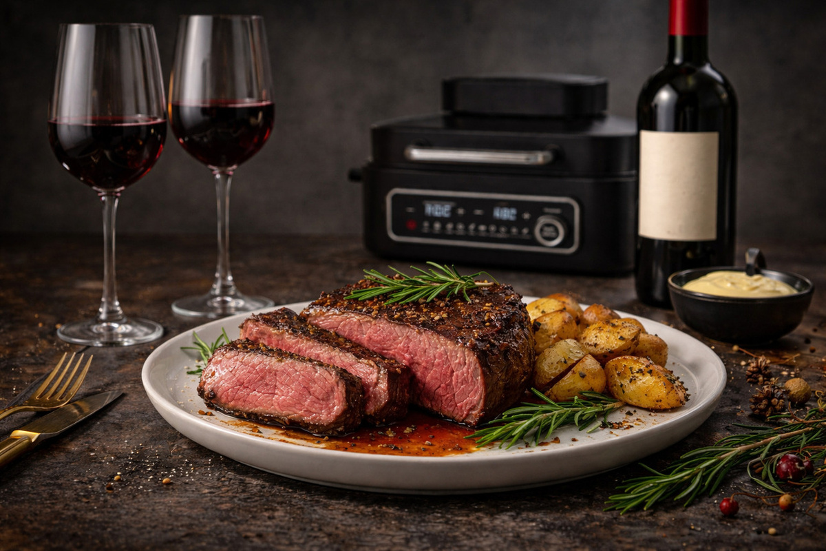 Путь к сердцу мужчины лежит через желудок — истина избитая, зато совершенно верная. Собрали лучшие рецепты, которые точно порадуют вашего избранника в праздник. Представителей сильной половины человечества обычно не тянет на салатики и изящные легкие десерты, так что лучше готовить что-то более основательное. Мясо и птица в этом смысле работают почти безотказно: это сытный белок, который дает длительное насыщение, поддерживает энергию и банально воспринимается мужчинами как нормальная и правильная еда. Плюс такие блюда проще сделать эффектными даже без сложных гастрономических ухищрений — достаточно хорошего куска мяса, правильной прожарки и понятных специй. А еще — удобного функционального аэрогриля. Это, кстати, позволит обойтись еще и без лишнего масла. Стейк из говядины с розмарином Красное мясо — это выстраданный эволюционно главный поставщик гемового железа, цинка и креатина. Эти микроэлементы напрямую связаны с выносливостью, уровнем тестостерона и качеством мышечной массы. В об