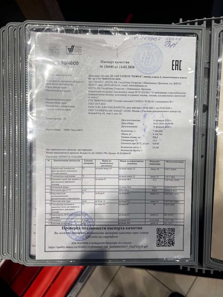 В итоге я проехал на 77 литрах Газпромнефть 574,2 км, то есть расход по заправке где то 13,4 литра, расход по бортовому показывал привычные 12,1 так же как показывает на танеко Сейчас сбросил бортовой опять посмотрим что покажет за неделю на танеко, но что то подсказывает что будет так же. Из паспорта танеко стоит отметить колоссальную температуру помутнения в -27 и предельную -50. Замерзнуть на такой солярке в нашем регионе нереально. Цетан при этом 53,2! Что конечно ниже Газпромнефти но в целом отличный результат для такой морозостойкости. Напомню минимальное цетановое число для наших машин 51 при госте на зимнюю солярку в 48) В итоге, всем добра. Выводы сделаем через недельку.