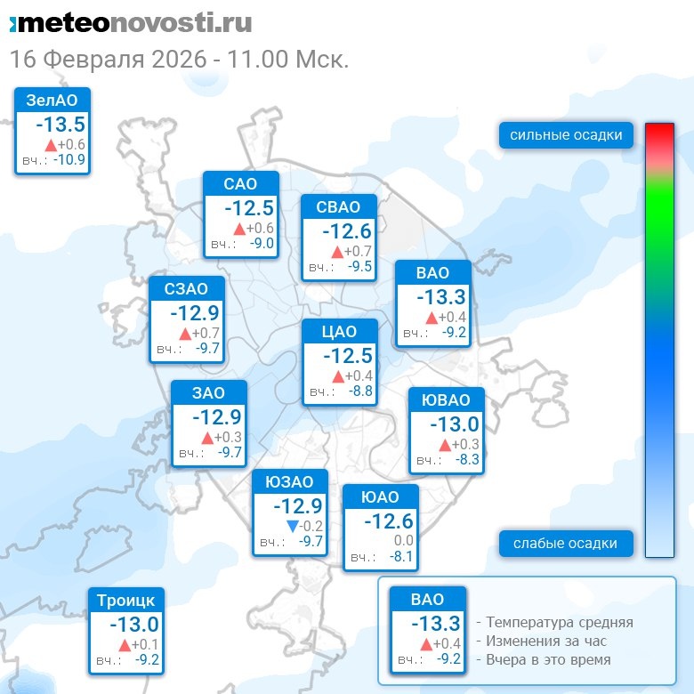 В 11:00 в Москве было от -14.1°C до -11.9°C, средняя температура -12.8°C #погода #Москва #зима #температура #16февраля #понедельник