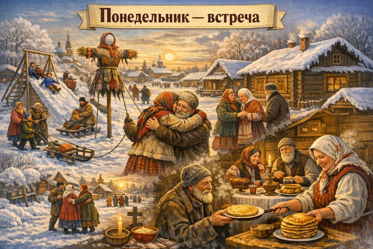 16 февраля в этом году — начало Масленичной недели, которая в православии именуется Сырной или Мясопустной седмицей. Понедельник, вторник и среда — Узкая Масленица, когда можно заниматься делами по хозяйству. А с четверга, начала Широкой Масленицы — все работы прекращались. Каждый день Масленицы носит своё название и имеет предназначение. Сегодня — встреча. В этот день заканчивали постройку снежных гор, качелей, балаганов, из подручных материалов сооружалось чучело Зимы, которое насаживали на кол и возили по улицам. По традиции свекор со свекровью отправляли невестку к отцу и матери, а вечером сами приходили к сватам в гости и обсуждали время и место гуляний, определялся состав гостей. В понедельник уже начинали печь блины, первый испечëнный блин в этот день отдавался малоимущим и на помин усопших. Проба первых блинов была скромной. Их ели со сметаной, топлёным или сливочным маслом. Масло, кстати, начинали сбивать специально к этому дню. Также начинали активнее употреблять молоко, про