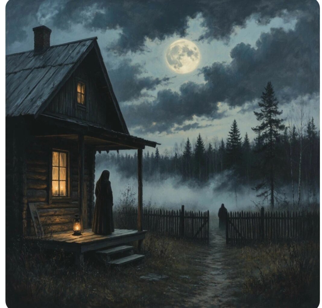 Зябко поёжившись, Катька решила лечь спать, бросив прощальный взгляд в окно. Выбравшись из густых туч, луна на миг подмигнула ей ледяным глазом, осветив кусок плетня и тёмный силуэт за ним. "Господи, кто же там, - обмерла она, - это верно просто куст похожий на человека!" Катя легла и поплотнее укутавшись в одеяло, постаралась уснуть, но сердце выстукивало безумный ритм, а воображение рисовало страшные картинки, того, что может таиться во тьме за стенами дома.