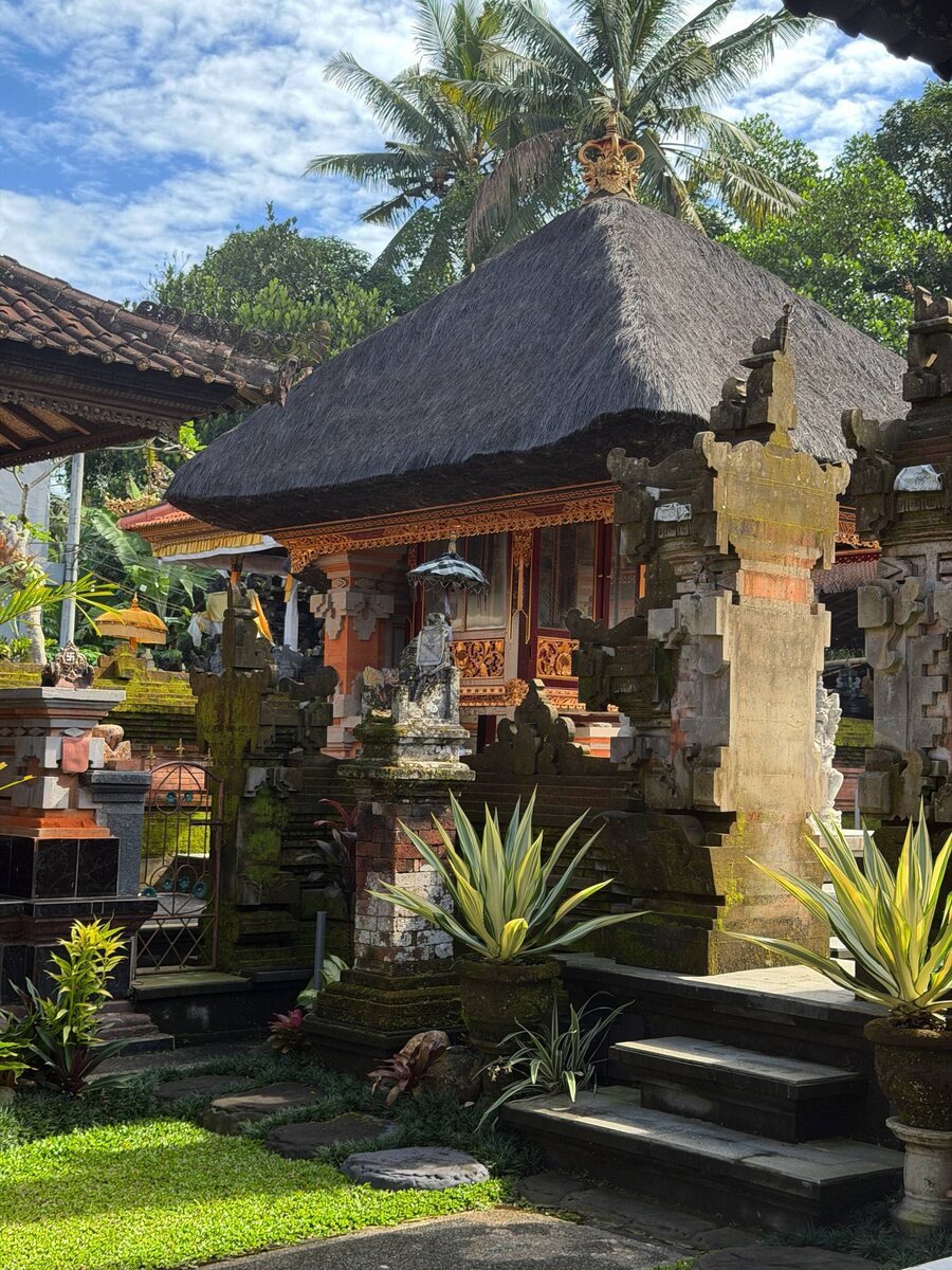 Несколько отдельных павильонов с резными дверями, внутренний двор с аккуратно подстриженными растениями, каменные ворота и даже собственное храмовое пространство навели на мысль, что хозяин дома — человек весьма обеспеченный. Большинство балийцев живут гораздо скромнее, в более простых дворах с минимумом построек. Конечно, было бы куда интереснее заглянуть в мир «обычного» жителя, но даже это оказалось любопытным: персонал рассказал достаточно много занятных фактов о жизни на острове (поделюсь ниже).