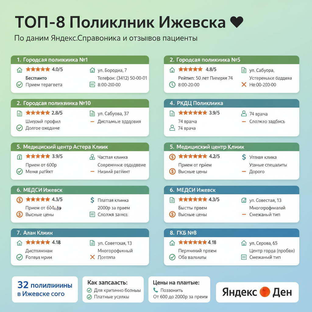 Ижевск — город не маленький, поликлиник тут хватает. И государственных, и частных. Но найти ту самую, где врач не смотрит в телефон, а смотрит на тебя, — задача со звёздочкой. Где лечат, а не просто ставят галочку в отчёте? Где очереди двигаются, а регистратура не хамит?