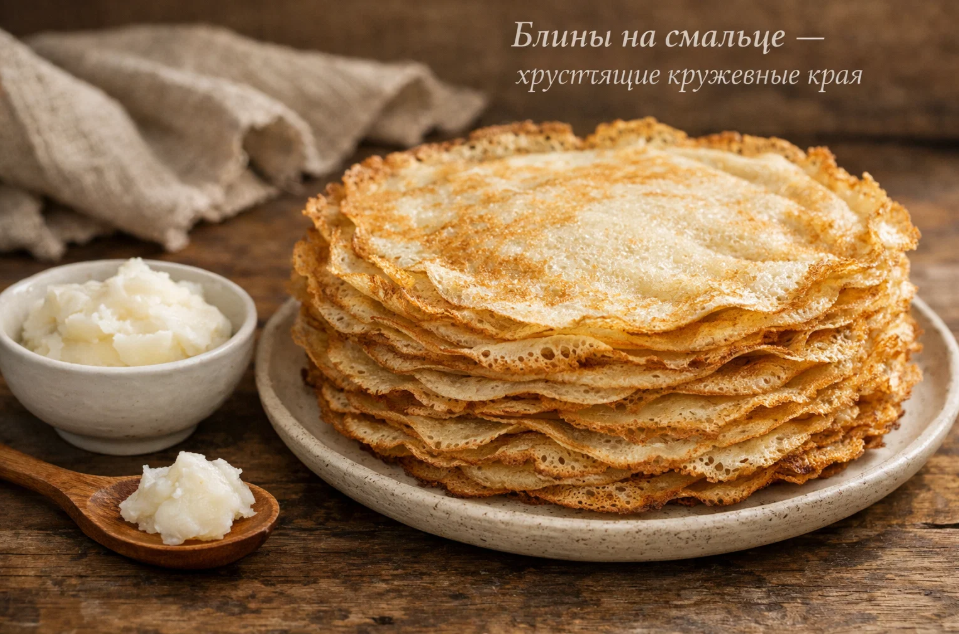 Есть ещё один фактор. Смалец имеет более высокую температуру дымления, чем большинство нерафинированных растительных масел. Это значит, что он лучше переносит сильный нагрев и не начинает гореть и выделять неприятный запах. На практике это означает, что вы можете жарить блины на более горячей сковороде, а именно высокая температура и даёт ту самую хрустящую кромку.