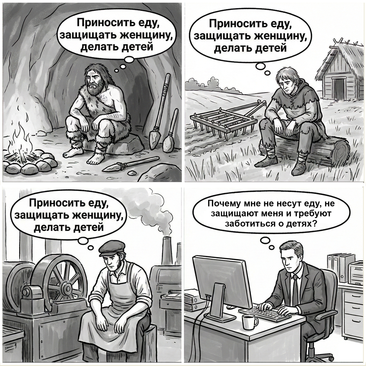 Женщин, детей и котов любят просто так, а мужчин - за результат. Это несправедливо и требует обсуждения и осуждения. Примерно такие претензии к жизни и окружающим появляются у мужчин, неудачно прошедших травмирующие кризисы или мужские курсы для обиженных. После чего начинается длительный период гнева, торга и депрессии, о том что детство закончилось и на дворе сейчас и навсегда - взрослая жизнь. Братан, открою тебе страшную тайну - да, на твои проблемы всем пофигу. У мужиков такая работа - тащить мир на своих плечах. Некому больше - кроме взрослых мужиков других взрослых вселенная не предоставила и не предоставит. Женщины там, конечно, тоже делают что-то, но это от безысходности и отсутствия надежного парня рядом, а не потому, что так должно быть или они от этого кайфуют. Любая бизнес-леди сядет дома с детьми и пилатесом, если вдруг найдет богатого мужика, которому сможет доверить свое благополучие. Да и хрен бы с ним с миром - свою жизнь для начала надо тащить. И своей семьи. Это так