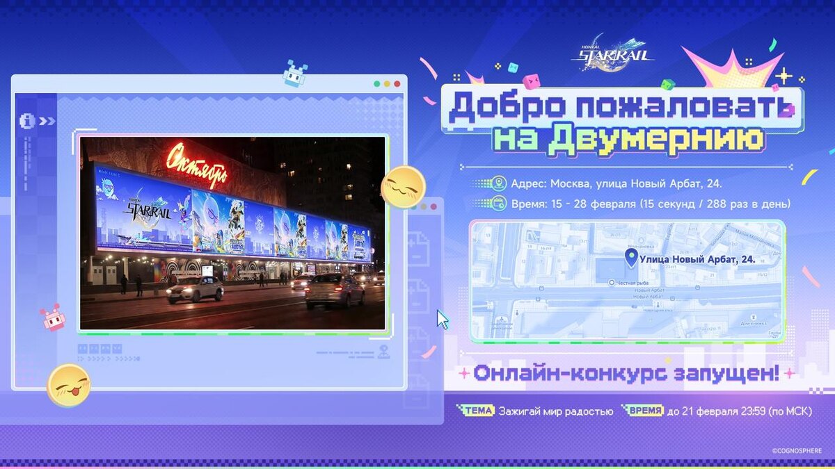 miHoYo (HoYoverse) запустила в России офлайн-акцию «Добро пожаловать на Двумернию». С 15 по 28 февраля 15-секундный ролик, посвящённый новому миру Двумерния, показывают 288 раз в день в Москве по адресу: Новый Арбат, 24. Таким образом студия продвигает обновление 4.0 и расширяет присутствие проекта в регионе. Кроме офлайн-кампании, разработчики проводят онлайн-конкурс для творческих «Первопроходцев» в соцсетях. Обновление 4.0 добавило в игру не только Двумернию, но и новых персонажей, изменения в режиме «Валютные войны», а также корректировки русской локализации. #HonkaiStarRail #HoYoverse #miHoYo #Двумерния #ИгровыеИвенты #HSR
