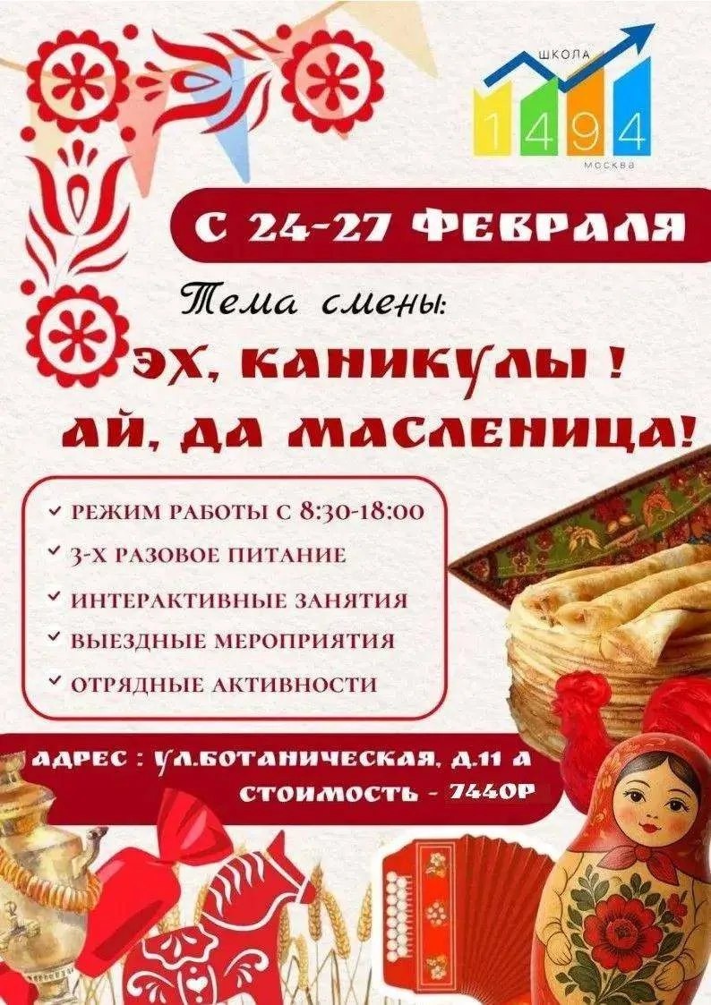 ! Напоминаем вам, что в период зимних каникул с 24.02.2026 по 27.02.2026 года в здании школы по адресу: ул. Ботаническая, д.11А, будет открыта группа творческого развития 🧸 «ПРО_Детство» 📌для обучающихся 1-4 классов. ❤️Команда наших педагогов подготовила познавательно-развлекательную программу: 🌞 Провожаем зиму с размахом 🎨 Творческая мастерская 🌳 Активные игры на улице и в школе 🚌 Интерактивная экскурсия: Наши супергерои ⏰ Режим пребывания детей в группе: вторник-пятница с 8.30 до 18.00. 🥘 Предусмотрено трехразовое питание (завтрак, обед, полдник). Регистрация на программу по ссылке https://www.mos.ru/pgu2/activity/groups?keyword=2426357 ❓По всем вопросам вы можете обратиться к педагогу-организатору Рябовой Идель Халиловне по телефону: 8 (962) 943-27-47. #ДОНМ #ШколыКолледжиМосквы #ГБОУШкола1494 #СВАО #МРСД5