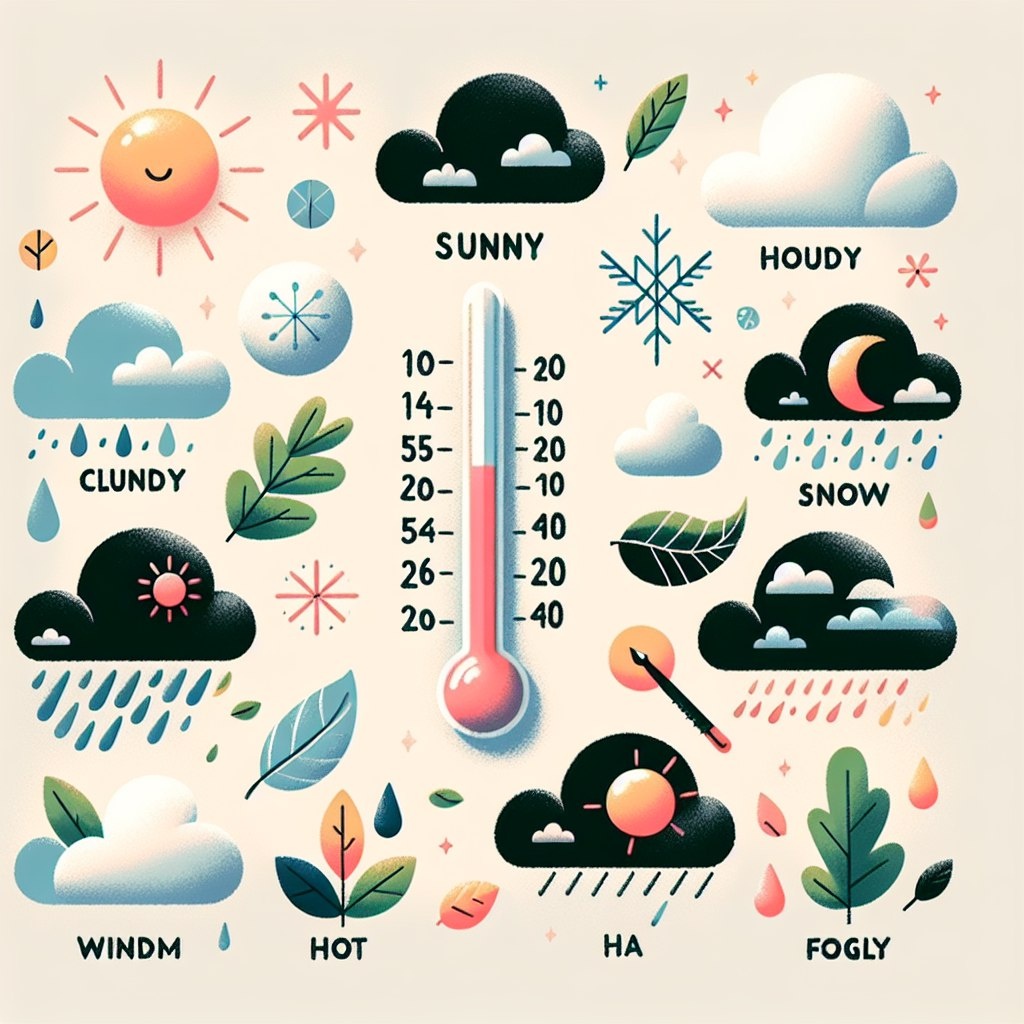 🌞🌧️🌡️ "Sunny" - солнечно "Cloudy" - облачно "Rainy" - дождливо "Snowy" - снежно "Windy" - ветрено "Foggy" - туманно "Hot" - жарко "Cold" - холодно "Warm" - тепло "Cool" - прохладно Предложение: "Today is sunny and warm." - Сегодня солнечно и тепло.