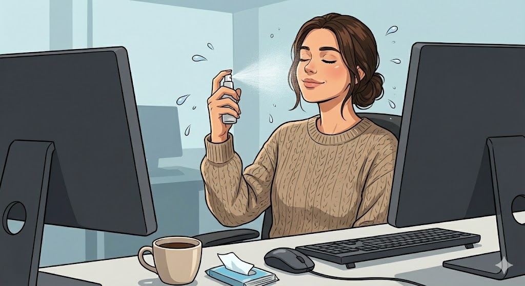 Батареи жарят, кондиционер вытягивает последнюю влагу, а монитор, кажется, притягивает пыль прямо к лицу. Знакомо? Офисный микроклимат (даже если ваш офис сейчас — это стол в гостиной) — суровое испытание для кожи. К обеду лицо часто начинает блестеть от обезвоживания, а к вечеру появляются шелушения и тот самый глубоко «уставший вид». Я держу в ящике рабочего стола (на расстоянии вытянутой руки!) «аварийный набор» из трех средств. Они не занимают места, стоят недорого, но помогают дожить до вечера свежей. Спрей-мист или термальная вода — первое, за что хватается рука в сухом воздухе. Но многие используют их неправильно: обильно брызгают и ждут высыхания.