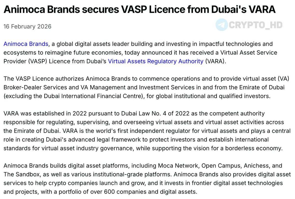 🇦🇪 Animoca Brands получила лицензию VASP в Дубае — релиз Теперь компания может оказывать брокерские услуги и управлять инвестициями в виртуальные активы в Дубае для институциональных и квалифицированных инвесторов. Ранее: Абу-Даби Crypto Headlines