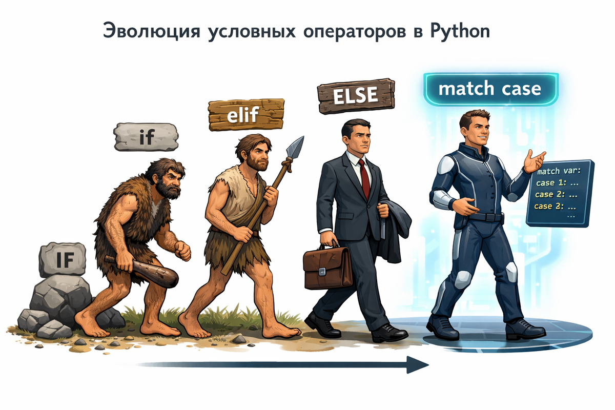 Привет, питонисты! 👋 Казалось бы, что может быть проще, чем if и else? Мы пишем их каждый день. Но синтаксис Python не стоял на месте. Давайте сегодня пробежимся по машине времени и посмотрим, как менялась работа с условиями: от первых версий до "вау-фич" из новых релизов. 🐍 Эпоха камня: Классический if-elif-else