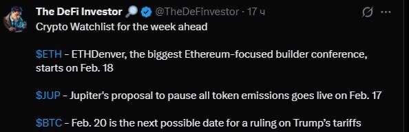 Крупнейшая конференция разработчиков экосистемы Ethereum. Могут появится новые инфоповоды для экосистемы ▪️ JUP — предложение Jupiter о приостановке эмиссии токенов вступает в силу 17 февраля. ▪️ BTC — 20 февраля возможная дата решения по тарифам со стороны Трампа. Может быть всплеск волатильности. ▪️ HYPE — ходят слухи о втором дропе от Hyperliquid 18 февраля, но вероятность этого небольшая. ▪️ LIT — Lighter планирует разрешить использование токенизированного LLP как залога. ▪️ FLUID — Fluid готовит запуск облегченного USD-хранилища для автоматизированного фарминга. ▪️ FT — публичные торги Flying Tulip стартуют 16 февраля. ▪️ ZAMA — публикация дорожной карты 2026 от Zama ожидается 19 февраля. Макро: 18 февраля пройдет заседание FOMC.
