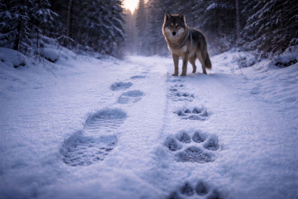 Волк зимой — это не осенний зверь. Он плотный, осторожный, экономный. Он не тратит силы зря. И если он идёт рядом — значит, есть причина. Либо он уверен, либо он голоден, либо он проверяет. Любой из этих вариантов не радует.