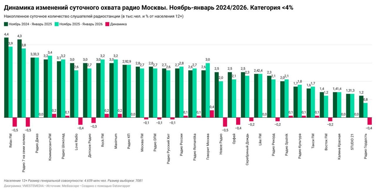 Из 45 радиостанций за год у 19 отмечается падение суточного охвата, у 19 рост и у 7 без изменений.