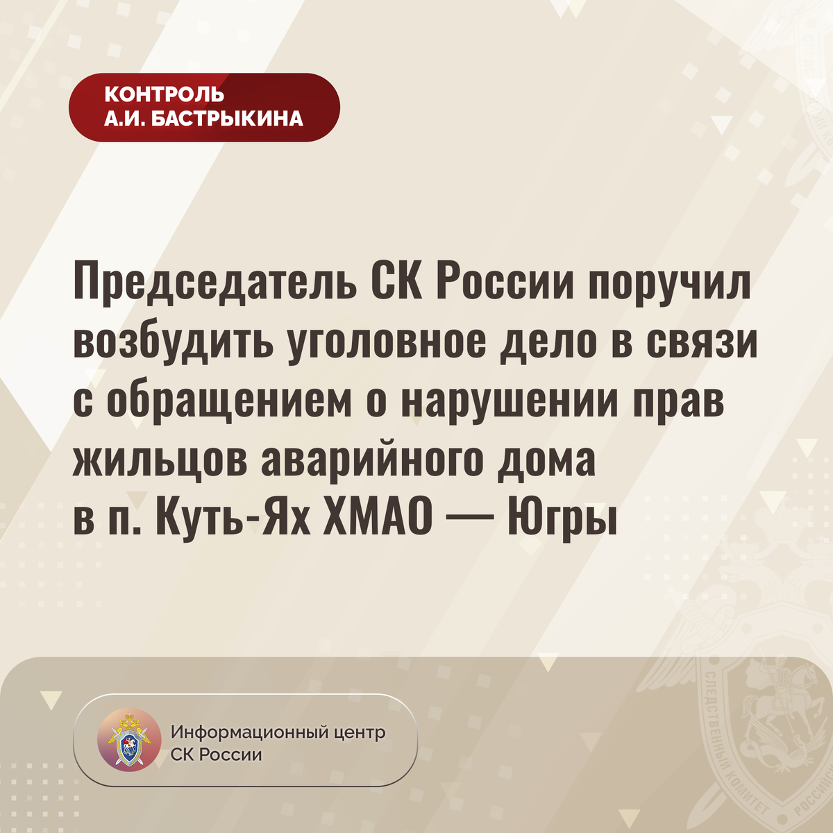 Председатель СК России поручил возбудить уголовное дело в связи с обращением о нарушении прав жильцов аварийного дома в п. Куть-Ях Ханты-Мансийского автономного округа — Югры В приёмную Председателя СК России А.И. Бастрыкина в социальной сети «ВКонтакте» обратился житель Ханты-Мансийского автономного округа-Югры по вопросу нарушения его жилищных прав. В собственности мужчины имеется жилое помещение в четырехквартирном доме 1981 года постройки на улице Луговой в поселке Куть-Ях, который в 2022 году ввиду высокой степени физического износа конструкций признан аварийным и подлежащим расселению до декабря 2025 года. Несмотря на обращения заявителя с просьбой о выплате компенсации, до настоящего времени мер к реализации его прав не принято. В СУ СК России по Ханты-Мансийскому автономному округу – Югре организована процессуальная проверка. Председатель Следственного комитета Российской Федерации Александр Иванович Бастрыкин поручил руководителю СУ СК России по Ханты-Мансийскому автономному