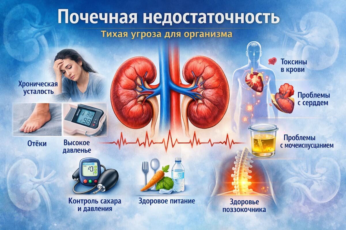 Каждый день они пропускают через себя десятки литров крови, удаляя: Когда фильтрация снижается, организм начинает «засоряться» изнутри. Сначала незаметно. Потом — ощутимо. Большинство людей не связывают эти признаки с почками: Особенно внимательными стоит быть людям с диабетом и гипертонией — именно эти болезни чаще всего приводят к хронической почечной недостаточности. Когда почки плохо фильтруют кровь: Поздние стадии требуют диализа — процедуры искусственной очистки крови. Но до этого обычно проходят годы постепенного ухудшения. На ранних этапах — да. Важно: И ещё один момент, о котором редко говорят. Почки находятся в зоне поясничного отдела позвоночника.