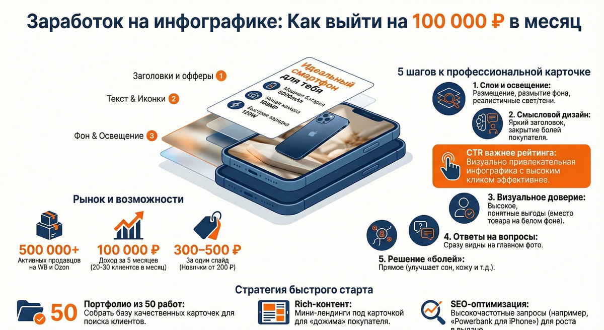 В бизнесе на инфографике для маркетплейсов твоя «малая экспертность» — это уже актив. Пока другие изучают теорию годами, рынок Wildberries, Ozon и Яндекс Маркета требует быстрых и качественных решений для миллионов товаров. Ниже — прагматичный план, как превратить твое умение работать в графических редакторах в работающую бизнес-модель без лишней мишуры. Запуск бизнеса на инфографике: от базовых навыков до прибыли. 1. Анализ фундамента: 3 причины, почему на этом можно заработать сейчас. Для успеха тебе не нужны уникальные инновации, достаточно встроиться в работающую экосистему. • Гигантский объем и рост рынка. На маркетплейсах работают более 500 000 активных селлеров (продавцов). Каждому из них нужно оформить от нескольких единиц до тысяч карточек товаров. Спрос постоянно растет, так как визуальный контент напрямую влияет на продажи. • Высокий потенциал LTV (Lifetime Value). LTV — это совокупная прибыль от одного клиента за всё время работы. Если ты качественно оформишь одну единицу т