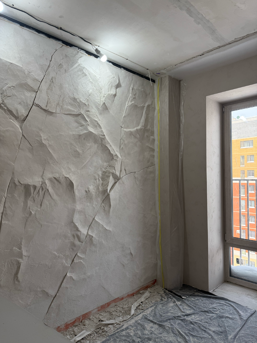 Заказчик хотел эффект, будто этот дом стоит прямо на скалистом берегу. Имитация горной породы, сделанная руками мастеров. Это вам не фотообои с принтом, тут всё по-настоящему: с глубиной, игрой тени и тактильными ощущениями. Коротко о главном (почему это круто): 1. Уникальность 100%. Даже если кто-то захочет повторить такой же рисунок, в точности не выйдет. Разводы, вкрапления, рельеф — ручная работа всегда живая. Второй такой «скалы» не существует. 2. Эффект монолита. В отличие от гипса или камня, здесь нет стыков и швов. Стена выглядит так, будто этот валун рос прямо из пола. Особенно эффектно смотрится на рассвете и закате, когда солнце скользит по выступам. 3. Вес и нагрузка. Для квартир это часто критично. Натуральный камень таких размеров просто рухнул бы вниз или потребовал мощного усиления перекрытий. А здесь — только легкая штукатурка на подготовленной стене. Как делали (немного «кухни» для коллег и любопытных заказчиков): Многие думают, что это просто накидали шпателем и