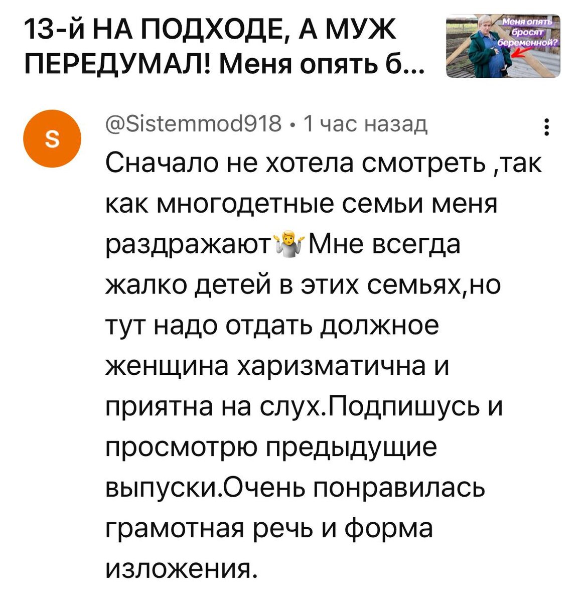 Сначала не хотела смотреть, так как многодетные семьи меня раздражают. Мне всегда жалко детей в этих семьях, но тут надо отдать должное: женщина харизматична и приятна на слух. Подпишусь и просмотрю предыдущие выпуски. Очень понравилась грамотная речь и форма изложения. Ну вот видите, всё-таки мои «два класса» средней школы сотворили чудеса! А может, просто свежий воздух в деревне да молочко парное хорошо на мой интеллект повлияли? Даже страшно представить, чтобы с моими детьми было, если б я той самой грамотной речью не обладала да харизму миру не явила! Признаюсь вам по секрету: на самом деле ваша Оля получила только 9 классов образования до своего первого брака. Моей матушкой внушалось мне тогда про то, что природа на детях-гениях отдыхает (гении естественно она и мой отец). Вот и мне нужно «отдохнуть» — то есть поскорее выйти замуж и желательно сразу родить детей, чтобы муж не сбежал от меня, такой дурочки... Муж не сбежал, но поиздевался знатно. А я, не выдержав натиска, через шес