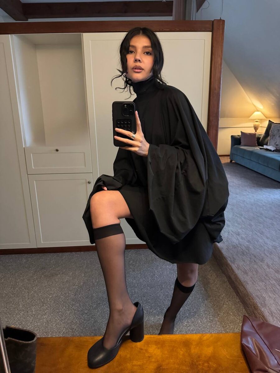 Выбор Мушарраф: total look Rendez-Vous — лаконичное чёрное хлопковое платье, кожаные туфли и акцентная бордовая сумка MM6 Maison Margiela.