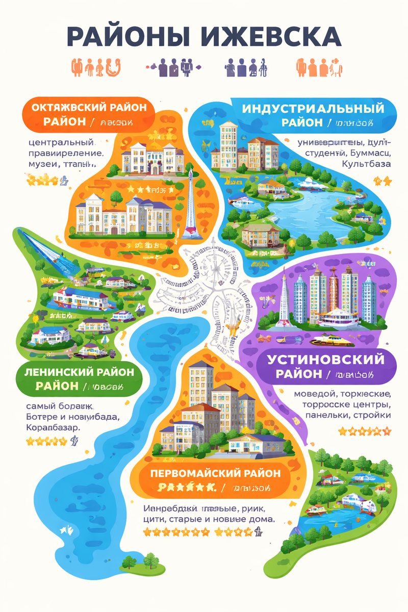 Выбирайте район не по карте, а по себе. Если любите суету и статус — Октябрьский. Если работу рядом и компактность — Устиновский. Если тишину и свой дом — Ленинский. Главное — приехать, пожить, походить пешком. Потому что Ижевск — город, который надо прочувствовать ногами.