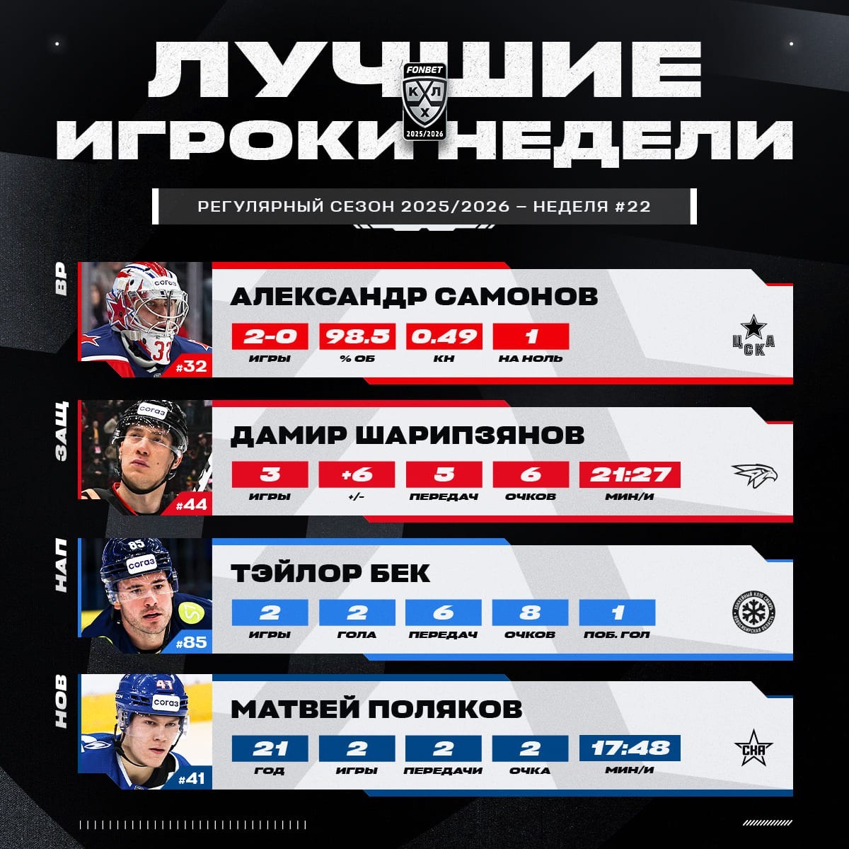 КХЛ определила лучших игроков 22-й недели сезона 2025/2026.