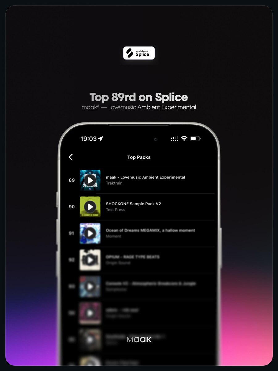 ! Наш недавний релиз семпл-пака «Lovemusic Ambient Experimental» недавно успел ворваться в топ-100 Splice и поднялся на 89-ую строчку. Летим ещё выше! ⭐️ ℹ️ #splice #чарт 🔗 maak® × подробнее • ⚡️ boost