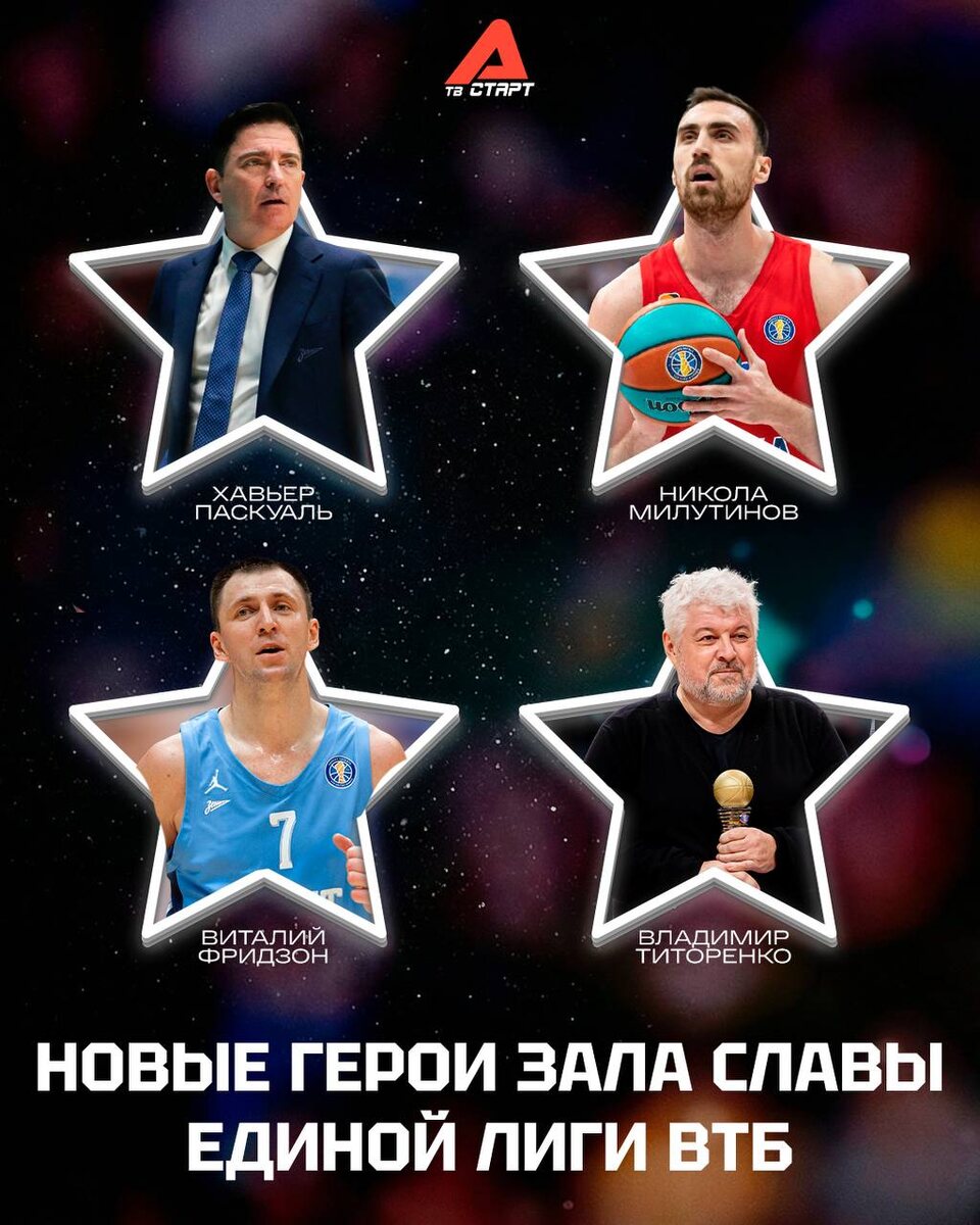 ! Единая Лига ВТБ официально объявила, что Хавьер Паскуаль, Виталий Фридзон, Никола Милутинов и Владимир Титоренко включены в Зал Славы! ❤️ — абсолютно заслуженно! Подписывайся на ТВ СТАРТ в MAX📲