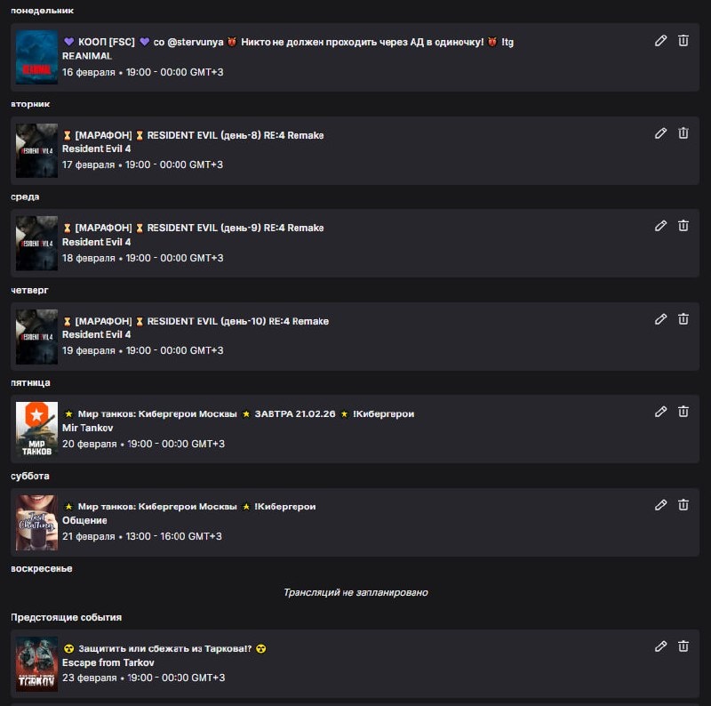 🗓 📆 ПН. 16.02 ⏰ 19:00 🎮 REANIMAL 👹 💜 КООП [FSC] 💜 со @stervunya 👹 Никто не должен проходить через АД в одиночку! 👹 !tg + Покажу что надарили в честь ДР!) 📆 ВТ. 17.02 - ЧТ 19.02 ⏰ 19:00 🎮 RESIDENT EVIL 4 ⛱ Remake ⌛️ [МАРАФОН] ⌛️ RESIDENT EVIL ⛱ 📆 ПТ. 20.02 ⏰ 19:00 🎮 Mir Tankov 😀 🌟 Мир танков: Кибергерои Москвы 🌟 ЗАВТРА 21.02.26 🌟 !Кибергерои ⏰ ПОЛНОЧЬ 🍿 КИНО-НОЧЬ на 📱 VK Видео Live 🍿 📆 СБ. 21.02 ⏰ 13:00 🎮 Mir Tankov 😀 IRL 🎤 🌟 ТУРНИР Мир танков: Кибергерои Москвы 🌟 !Кибергерои 📆 ПН. 23.02 ⏰ 15:00 🎮 REANIMAL 👹 💜 КООП [FSC] 💜 со @stervunya 👹 Никто не должен проходить через АД в одиночку! 👹 ⏰ 19:00 🎮 Escape from Tarkov 🔫🔫 ☢️ Защитить или сбежать из Таркова!? ☢️ 1️⃣ Приходите смотреть на Twitch и ставь ❤️ на VKВидеоLive!! ⏺ Все наши ресурсы.