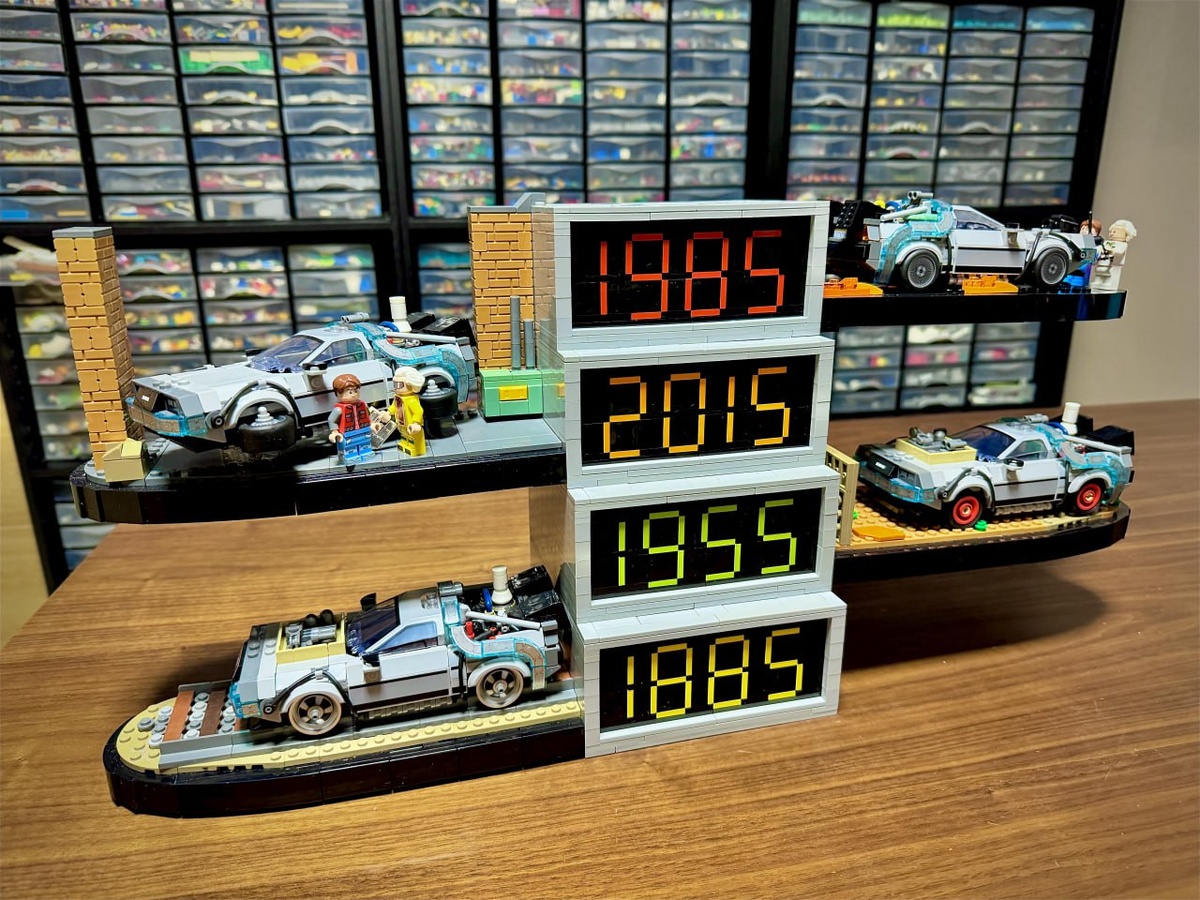 🚗 Автор hachiroku24 сделал дисплей сразу для четырёх Делореанов из LEGO — каждая версия в своём «времени».