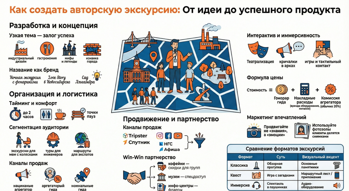 Приветствую. Если вы читаете этот текст, значит, у вас уже есть база — ваши знания и интерес к определенной теме, будь то история архитектуры, секретные гастро-точки города или особенности инженерных сооружений. Моя задача как вашего ментора — помочь вам упаковать этот багаж в работающий бизнес-продукт, не дожидаясь «идеального момента» или огромных инвестиций. Малая экспертность — это уже достаточный фундамент для старта. 1. Анализ фундамента: на чем вы заработаете прямо сейчас На основе анализа текущего рынка и опыта экспертов можно выделить три ключевых преимущества вашей ниши, которые позволяют монетизировать знания немедленно: 1. Запрос на уникальность и «изнанку» города. Людям надоели глянцевые маршруты и стандартные фразы экскурсоводов в стиле «посмотрите направо». Современный потребитель ищет новые впечатления, хочет заглянуть во дворы, закоулки и узнать «непричесанную» историю. Ваша локальная экспертность (например, знание конкретного района) — это эксклюзивный товар. 2. Экон