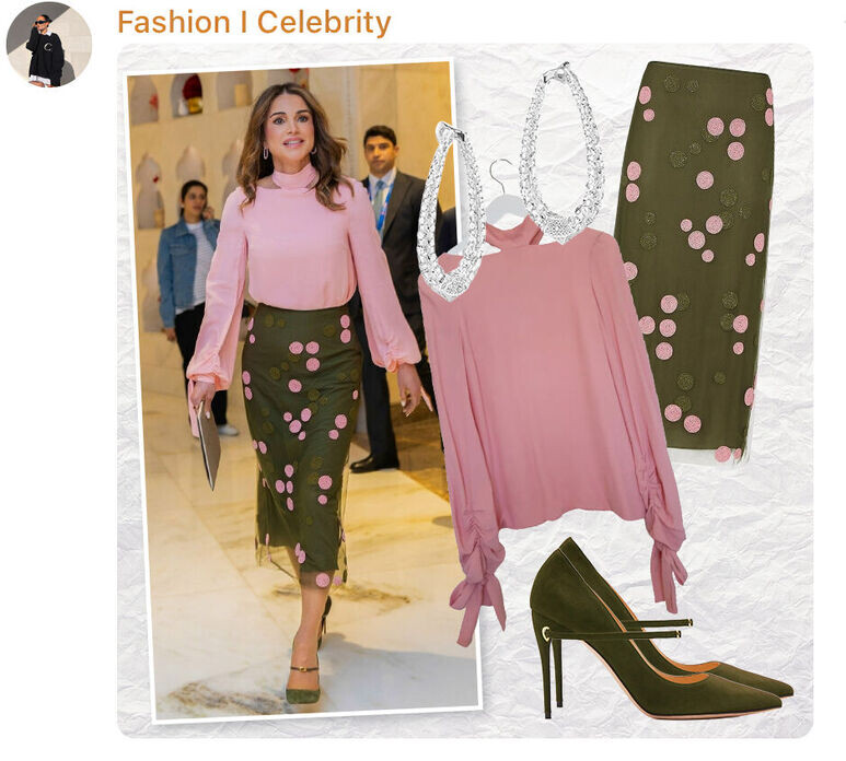 Королева Иордании Рания аль-Абдалла посетила Всемирный бизнес-саммит, проходящий в Нью-Дели, в Индии. В центре деловой программы — вопросы цифровизации, партнерства в области инноваций и вовлечения женщин в глобальную экономику. Однако не меньший интерес у прессы и общественности вызвал образ королевы, продуманный до мельчайших деталей. Для встречи с лидерами мнений и бизнеса она выбрала ансамбль в нестандартной цветовой гамме: нежно-розовая блуза с драматичными объемными рукавами и юбка-карандаш оливкового оттенка, с трендовым принтом полька-дот. Дополнили аутфит элегантные туфли-лодочки и тонкий клатч. Эксперты тут же признали вещи от известных брендов: блузка от Rosetta Getty; юбка от Fendi; туфли от Jennifer Chamandi; серьги от Boghossian Jewels. Сочетание пастельного розового и приглушенного зеленого тут же окрестили в Сети «мягкой силой», поскольку образ получился одновременно строгим и открытым. Эксперты по этикету отмечают: выбор палитры для визита в Индию отнюдь не случаен. Пр