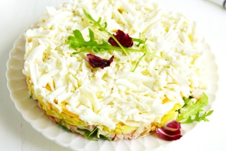 И завершающий слой - яичные белки, так же натертые на крупной тёрке.