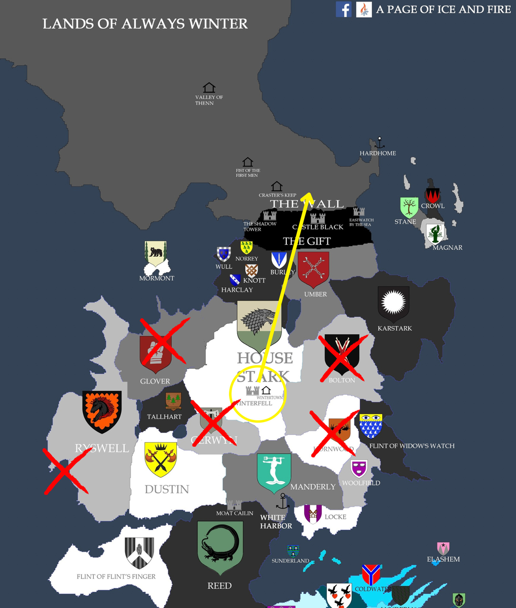 Бран движется примерно в направлении стрелки. Все красные крестики — это места, куда Лювин специально советует Оше не ходить. Он предлагает Мандерли или Умберов, но отмечает, что добраться до них может быть сложно. И он прав — куда бы она ни пошла, она, скорее всего, столкнется с Болтонами или Железнорожденными. Кроме того, и я уверен, что они оба об этом думали, но они НА САМОМ ДЕЛЕ не знают, кому можно доверять на Севере — история с Карстарками, вероятно, начала распространяться до их дома, мы узнаем позже, что Умберы начинают играть на два фронта, чтобы защитить Великого Джона, а Оша на самом деле никого из этих людей не знает! И здесь Лювин, умирая, по сути, говорит: «Тебе, Оша, не повезло».
