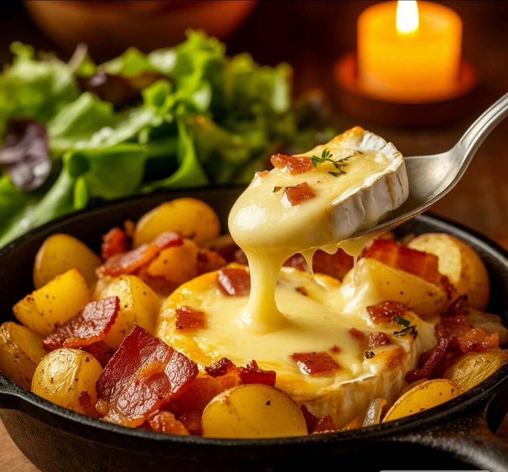 ПОЧЕМУ ЭТО ШЕДЕВР? 🎨 Этосырная лава, которая сводит с ума! Камамбер плавится нежнее, чем обычный сыр, он становится тягучим и сливочным. Картофель пропитывается соком бекона и вином, а мускатный орех добавляет изюминку. 12 минут — и вы в Савойе! 🇫🇷✨
