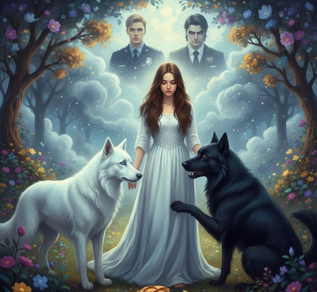 Два огромных пса. Один — ослепительно белый, как зимнее утро; другой — чернильно-чёрный, словно вырезанный из самой безлунной ночи. Они бросились ко мне, ластясь и утыкаясь холодными носами в ладони. Я кормила их тёплым хлебом, пахнущим домом, но стоило им поднять глаза друг на друга, как тишина сада взрывалась потусторонним рыком. Это не была просто драка — это был спор двух стихий за мою душу.